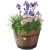 • Tough plastic base allows it to survive harsh weather that would normally rot in the base of a fully wooden barrel.